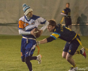 The Colts were first on the scoreboard again with a pass from Brown to Kevin Woods, but Carnegie hit back almost immediately with a pass from Dawkins to Brandon Lamb. Both teams missed their XPs so it was 6 – 6 at half time. Carnegie went ahead after the break with a TD from Guthrie and the XP from Lamb, but the Colts were not finished and Brown passed to Duffie for both the TD and the XP to tie the game again. The Colts then got a stop which gave them a chance for the win. As the clock hit zero Brown put the ball into the opposition end-zone, but unfortunately it was a Carnegie player who came down with it. Still a tie, 13 – 13, was a good result.